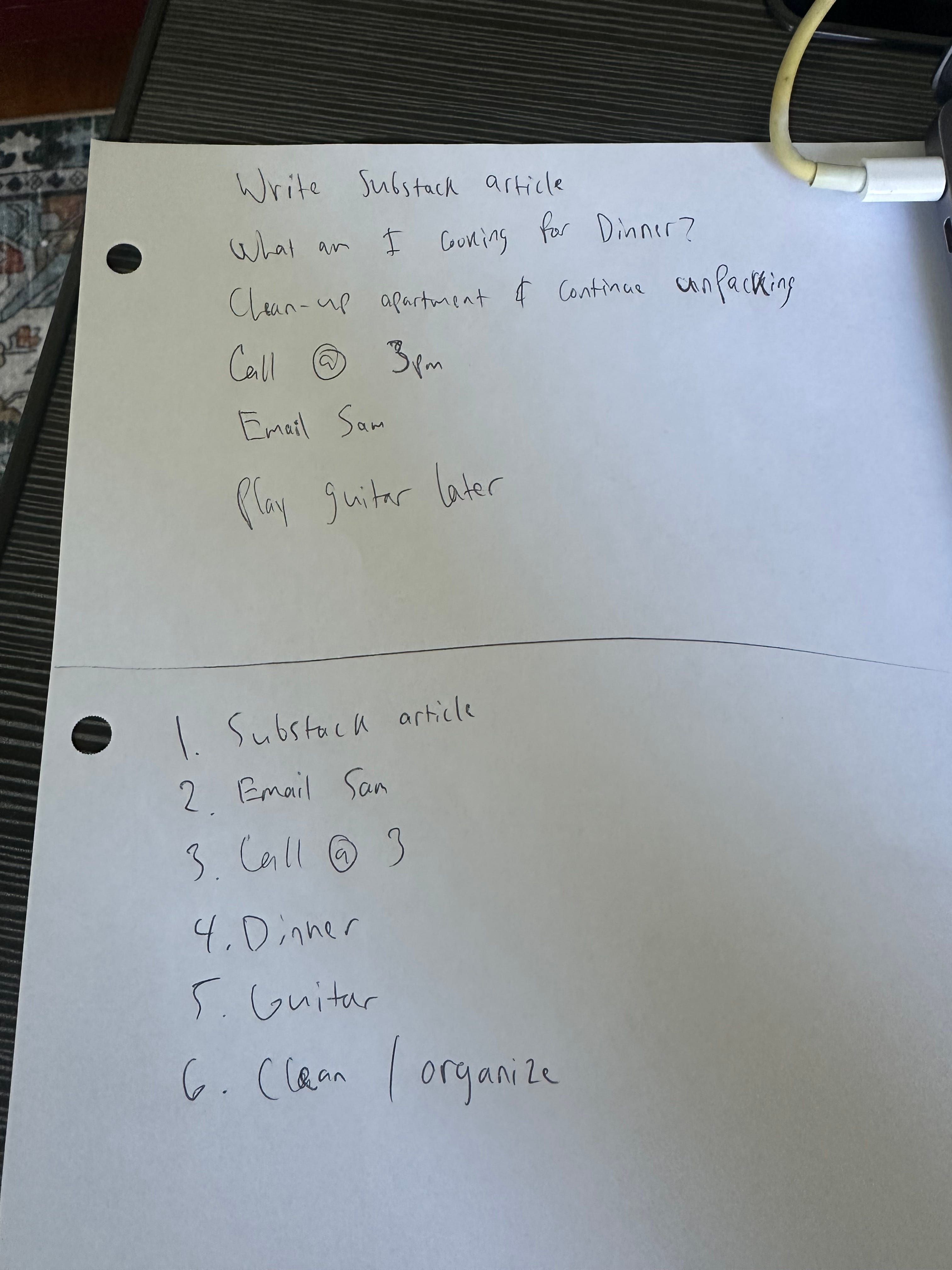 I did this on behalf of myself. As you can see in the first half of the page, it's all of the things running through my mind. Some work-related tasks, some personal things like cleaning up/organizing my apartment, some personal stuff like playing guitar, and some random thoughts like what I want to eat for dinner. This activity is discrimination-free; just get all of the ideas out of your head and onto the paper.